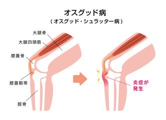 特に10歳から16歳の男児に多く、膝蓋骨の下部にある脛骨粗面に痛みが生じます。